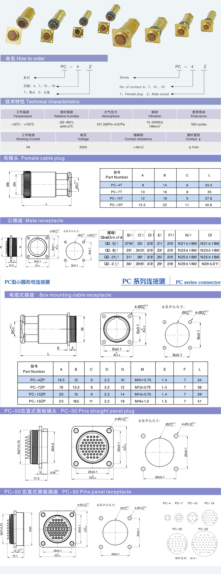PC series circular connectors have the features of small size,light weight,convenient application with threaded-coupling connection..It can be interchanged with Russian type PC,they are widely used for the electrical connection between electrical equipments and instruments.